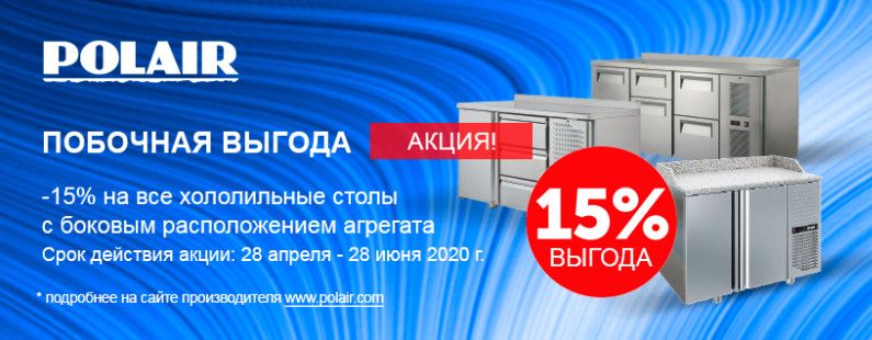 ТД «Polair» сообщает вам о начале Акции «ПОБОЧНАЯ выгода»! В рамках Акции Рекомендованные Розничные Цены на ВСЕ холодильные столы с БОКОВЫМ расположением агрегатов будут снижены на 15%!