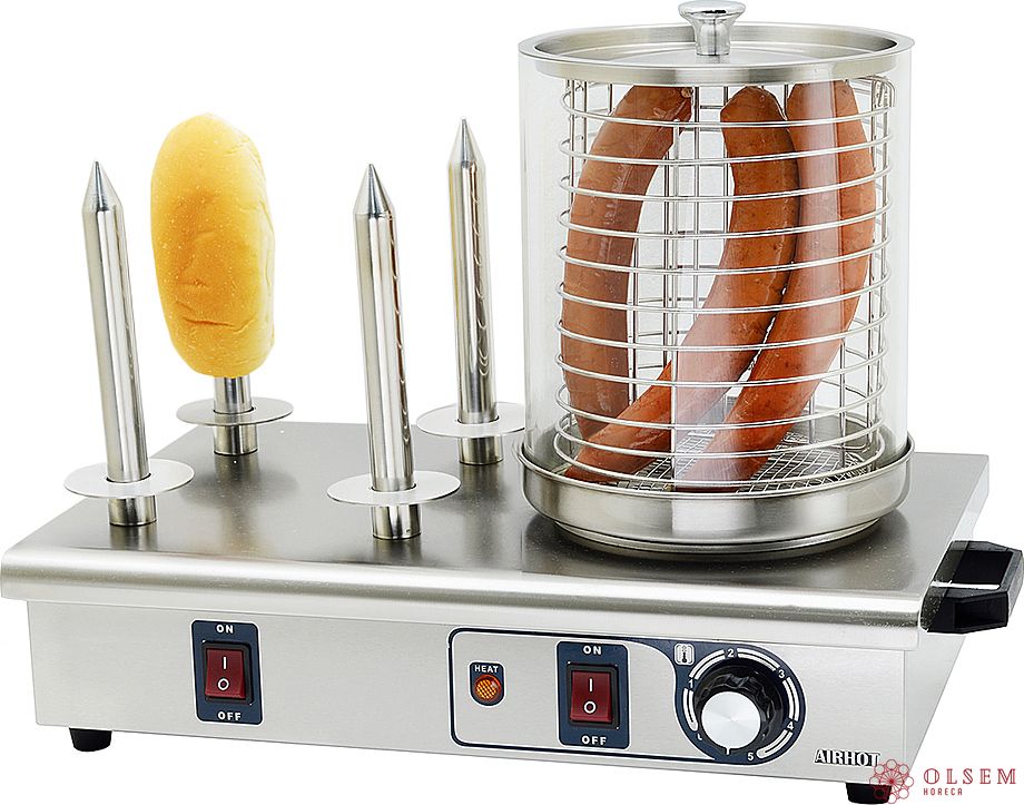 Аппарат для хот-догов Airhot HDS-04 используется на предприятиях общественного питания и торговли для приготовления сосисок на пару и поддержания оптимальной температуры уже обжаренных сосисок и булочек. Модель оснащена терморегулятором, ёмкостью для воды (паровой баней) и раздельным нагревом колбы и 4-х штырей для булочек. Корпус и штыри выполнены из нержавеющей стали, колба - из стекла.