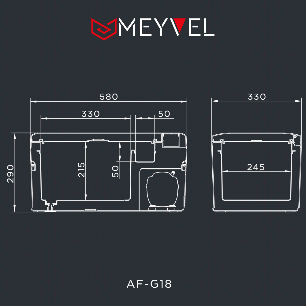 Переносной автохолодильник MEYVEL AF-G18 предназначен для охлаждения и глубокой заморозки, хранения и транспортировки продуктов питания и напитков в легковых и грузовых автомобилях, автодомах, специальной технике, лодках, катерах, яхтах, других видах транспорта и в быту. Модель оснащена компрессором, электронным термостатом, 2 камерами, дверцей с фиксатором и защелкой, сенсорной панелью управления и жидкокристаллическим дисплеем с высокими яркостью и разрешением. Внешняя облицовка корпуса выполнена из прочного пластика, теплоизоляция – пенополиуретан высокой плотности.