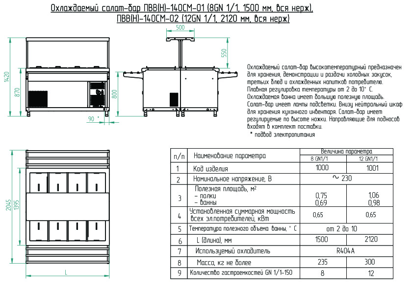 Салат-бар Abat ПВВ(Н)-140СМ-02 предназначен для демонстрации, охлаждения, кратковременного хранения блюд, холодных закусок и напитков в составе линий раздач на предприятиях общественного питания и торговли. Модель оснащена регулируемыми по высоте ножками.