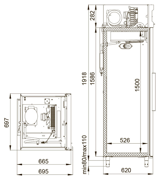 - Автоматическая оттайка испарителя с системой испарения конденсата упрощает обслуживание и предотвращает накопление льда.