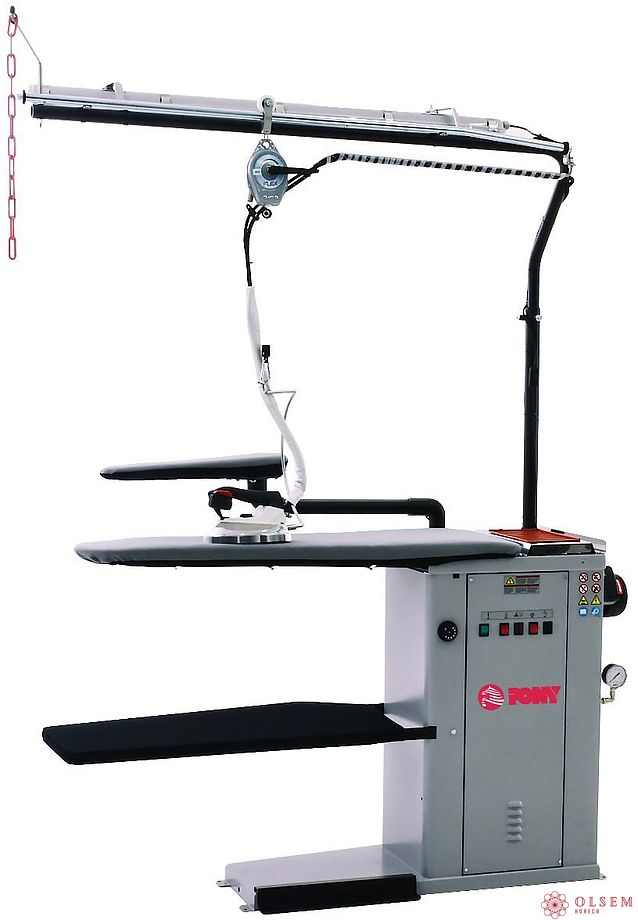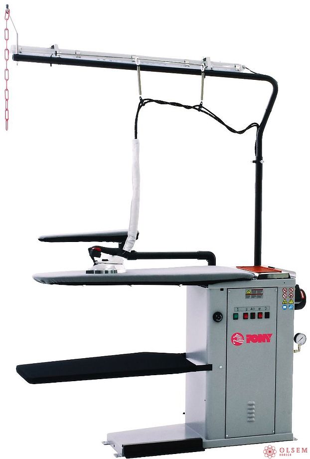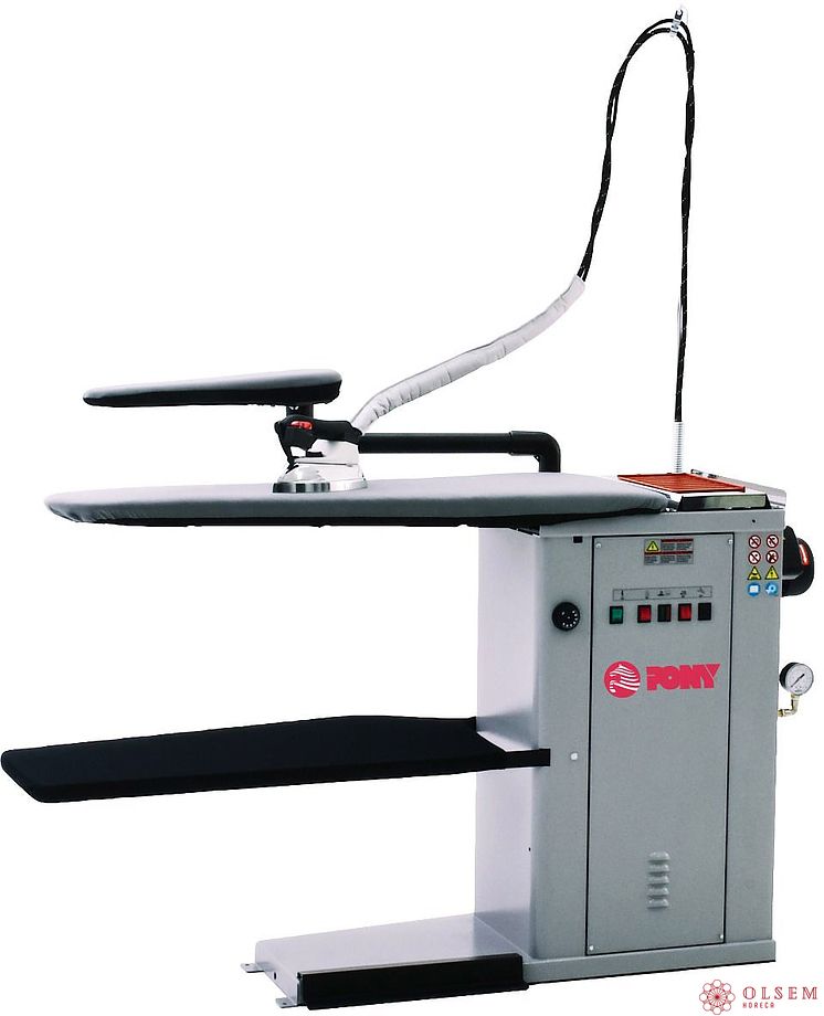Гладильный стол PONY FVC используется в прачечных образовательных, оздоровительных заведениях, производственных предприятиях, в поликлиниках, гостиницах, детских садах, общежитиях, больницах, роддомах для глажения фасонного белья с помощью утюга. Стол оснащен паровым утюгом, аспиратором и встроенным автоматическим электрическим бойлером, который дает возможность питать от него второй утюг, расположенный на радом стоящем столе.