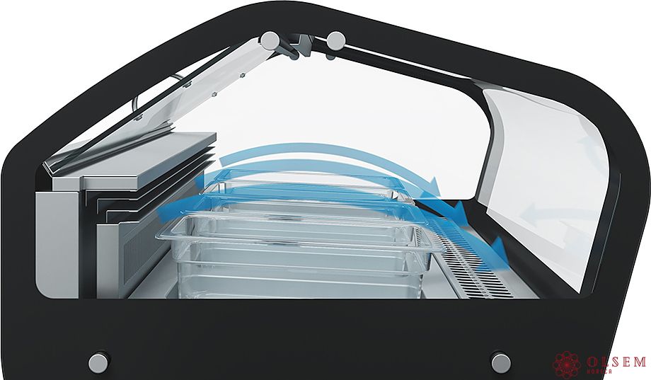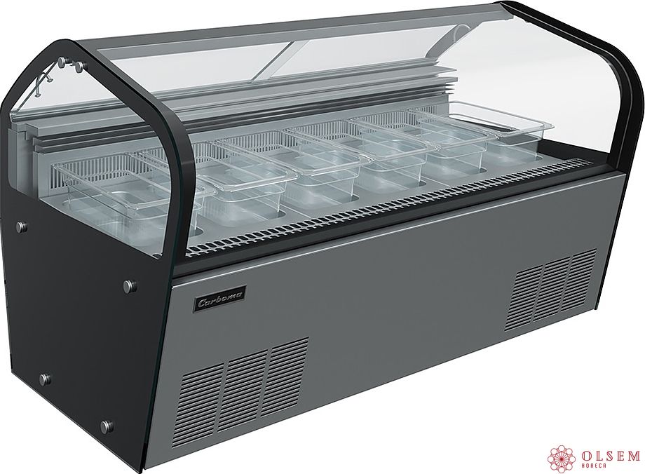 Витрина для мороженого Carboma I60 VL 1,2-1 JOY используется на предприятиях общественного питания и торговли для охлаждения, хранения и демонстрации мягкого и других видов мороженого. Модель оснащена электронным блоком управления Carel, изогнутым фронтальным и 2 боковыми стеклопакетами высокой степени прозрачности. Каркас выполнен из стали с антикоррозийным покрытием, фронтальная панель и экспозиционные поддоны – из нержавеющей стали, термоизоляция – из пенополиуретана, гастроемкости – из прозрачного поликарбоната.